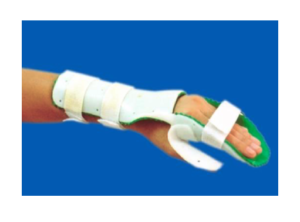 6.3 Anti-spastic/Stretching splint: เป็นอุปกรณ์ดามที่ช่วยกางนิ้วจะใช้ในผู้ป่วยที่นิ้วมือเกร็งเบียดกันต้องการการยืดแบบแยกนิ้ว ข้อมือกระดกขึ้น 15–20 องศา ในส่วนที่เป็นพัดรองรับข้อนิ้วมือโดยอาจจัดให้อยู่ในท่าเหยียดตรงหรืองอเล็กน้อยแล้วแต่ระดับการเกร็งของนิ้วมือและอาจทำเป็นร่องเพื่อให้วางนิ้วได้สะดวกไม่เลื่อนไปมาหรือติดสายรัดแต่ละนิ้วเพิ่มได้
