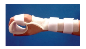 6.4 Soft splint: เป็นอุปกรณ์ดามที่ทำจากวัสดุนิ่ม จัดท่าให้ผู้ป่วยอยู่ในท่ากำมือเล็กน้อย นิ้วหัวแม่มืออยู่ในท่า กางนิ้ว อุปกรณ์ดามชนิดนี้ว่าสามารถช่วยลดภาวะหดเกร็งของกล้ามเนื้อนิ้วมือและยังสามารถช่วยให้ผู้ป่วยแบมือได้ หลังจากใส่แล้ว 30 นาที
