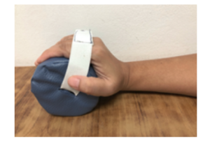 6.2 Conical/Roll hand splint: เป็นอุปกรณ์ดามที่ส่วนปลายม้วนเข้ามาลักษณะคล้ายการกำโคนหรือทรงกระบอก เหมาะสำหรับผู้ป่วยที่มีอาการเกร็งที่นิ้วมือค่อนข้างมาก ตัวอุปกรณ์ดามวางด้านบนของแขน ข้อมือกระดก 15–20 องศานิ้วมืออยู่ในท่ากำทรงกระบอก ซึ่งความกว้างของทรงกระบอกขึ้นอยู่กับระดับอาการเกร็งของผู้ป่วยส่วนนิ้วหัวแม่มือวางในลักษณะ Opposition