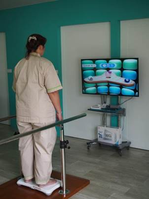 1.การฝึกการลงน้ำหนัก การทรงตัวด้วยเกมฝึก Balance โดนเกมนี้จะให้ผู้ป่วยฝึกการยืนทรงตัวโดยถ่ายน้ำหนักซ้าย-ขวา, หน้า-หลัง ในขณะยืนบน balance board และดึงตัวกลับสู่จุดศูนย์กลางเพื่อลงน้ำหนักขาทั้งสองข้างให้เท่ากัน