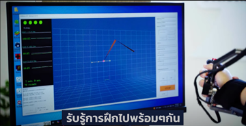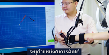 2.หุ่นยนต์ฝึกแขน EnMotion 3D เมื่อเกิดการเคลื่อนไหวที่ส่วนแขนของหุ่นยนต์ เซนเซอร์จะรับสัญญาณเพื่อแสดงผลการออกแรงที่จอ monitor จากนั้นหุ่นยนต์จะทำงานเพื่อช่วยให้ผู้ป่วยเกิดการเคลื่อนไหวต่อเนื่องตามการเคลื่อนไหวที่กำหนด หากผู้ป่วยออกแรงผิดมัดกล้ามเนื้อหุ่นยนต์จะแสดงผลผ่านหน้าจอ และออกแรงดึงกลับอย่างนุ่มนวลเพื่อเป็นสัญญาณเตือน และหากผู้ป่วยไม่ออกแรงช่วย หน้าจอจะแสดงผลให้เห็นในทันที