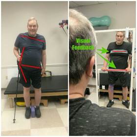 ซึ่งเทคนิคการกระตุ้นผู้ป่วยด้วย Visual feedback สามารถทำได้อย่างง่ายโดยการใช้กระจกเป็นเครื่องมือในการ Feed back เพื่อให้ผู้ป่วยได้เห็นตนเองขณะฝึก โดยขณะการฝึกเราจะดูตำแหน่งของร่างกายการลงน้ำหนัก การนั่ง การยืน การเดิน ว่าขณะยืนตรงลงน้ำหนักถูกต้องหรือไม่ ตัวเอียงไปทางด้านใดด้านหนึ่งหรือไม่ รวมไปถึงการฝึกแขน เช่น ออกแรงถูกต้องหรือไม่ ออกแรงได้เท่าไหน มีการเคลื่อนไหวทดแทนหรือไม่โดยมองตนเองขณะฝึกในกระจกเพื่อให้มองเห็นตนเองขณะฝึก เป็นการให้ Visual feedback แก่ตนเอง